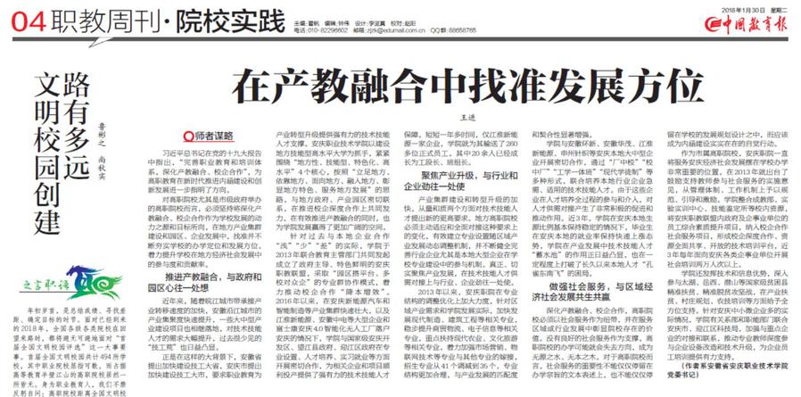 1月30日,我院党委书记王进撰写的《在产教融合中找准发展方位》一文刊发在《中国教育报》第4版“职教周刊·院校实践”栏目,全文如下: