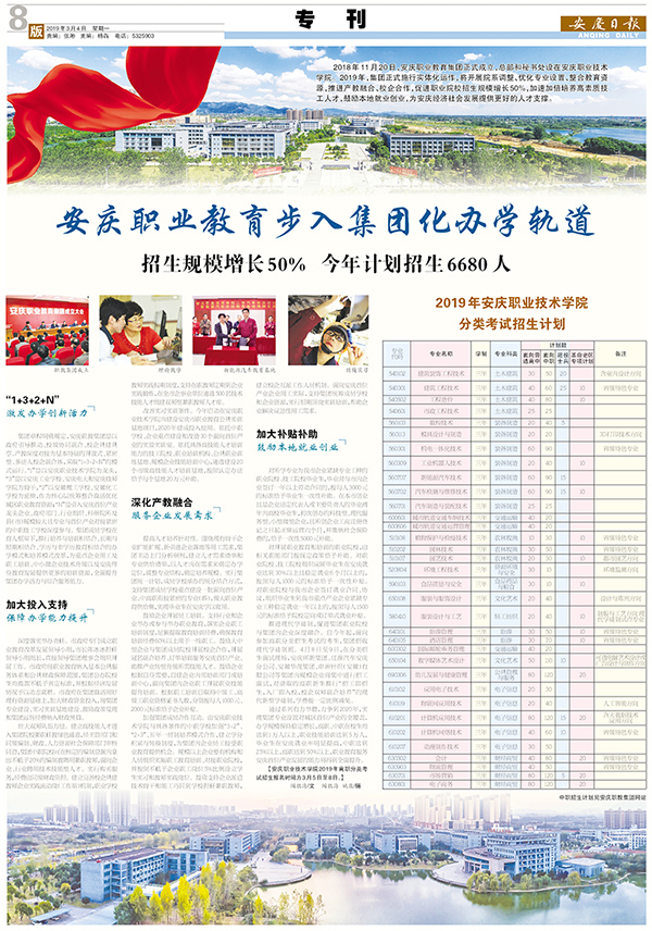 2018年11月20日,安庆职业教育集团正式成立,总部和秘书处设在beat365中国唯一官网。2019年,集团正式施行实体化运作,将开展院系调整、优化专业设置、整合教育资源,推进产教融合、校企合作,促进职业院校招生规模增长50%,加速加倍培养高素质技工人才,鼓励本地就业创业,为安庆经济社会发展提供更好的人才支撑。