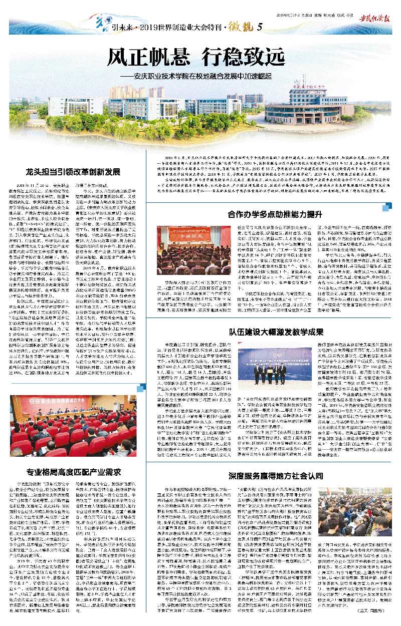 这些成绩的取得,离不开学院长期坚持立足地方、服务地方、融入地方的办学思路。从围绕产业设专业到校企合作育人才,从提供技能型人才支撑到推出技术创新服务,从服务企业、产业园区到直接与县、区政府开展全面战略合作,从推动成立安庆职教联盟到被市委市政府确定为安庆职教集团龙头单位……beat365中国唯一官网在探索高职办学规律、创新高职发展实践之路上加速崛起,实现了特色化高质量发展。