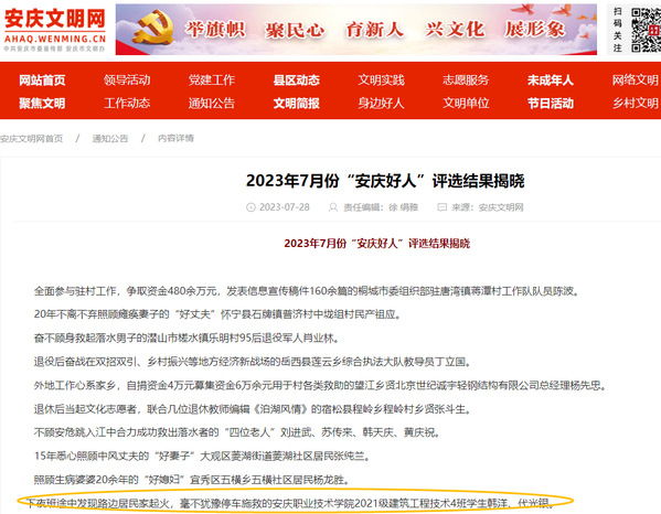 近日,从安庆市文明办获悉,经过推荐、审核、评审等程序,7月份“安庆好人”评选结果揭晓,beat365建筑工程学院2021级建筑工程技术4班学生韩洋、代光银双双入选。