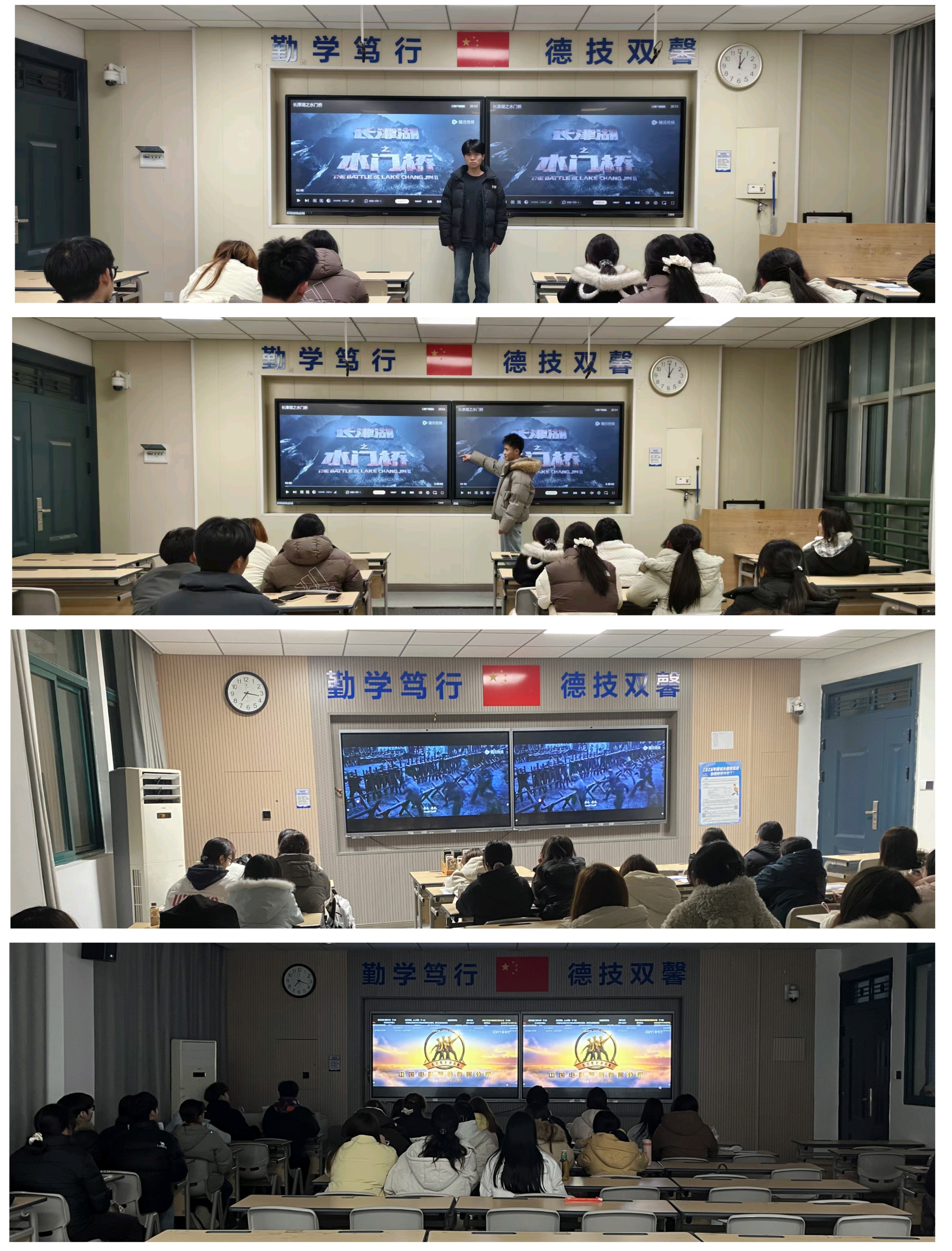 当晚七时,各班教室观影活动有序开始。影片中志愿军将士顶着零下四十摄氏度严寒坚守阵地、以身躯铸就“冰雕连”等场景,深深震撼了在场同学,许多人感动落泪。观影结束后,同学们结合自身体会展开交流。早期教育专业赵正勇同学表示:“看到战士啃冻土豆、穿单衣作战,才真正明白‘岁月静好’的背后是无数人的负重前行。我们应珍惜当下,以专业所学回报祖国。”旅游管理专业王俊杰同学说:“长津湖的冰雪能凝固身躯,却冻不住炽热的信仰。作为文旅学子,我们要努力讲好中国故事,传承这份精神。”