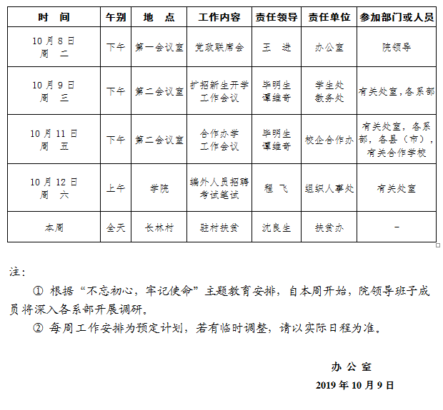 2019-2020学年第一学期第7周(10.7-10.13)工作安排