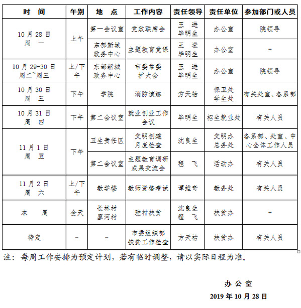 2019-2020学年第一学期第10周(10.28-11.3)工作安排