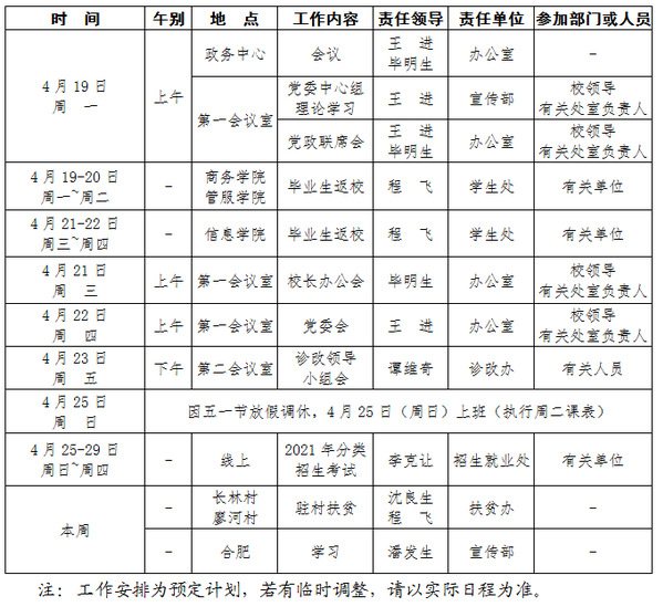 2020-2021学年第二学期第8周(4.19-4.25)工作安排