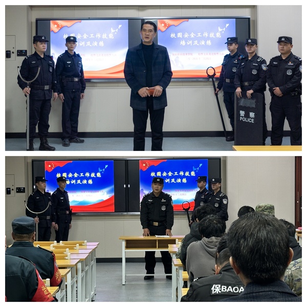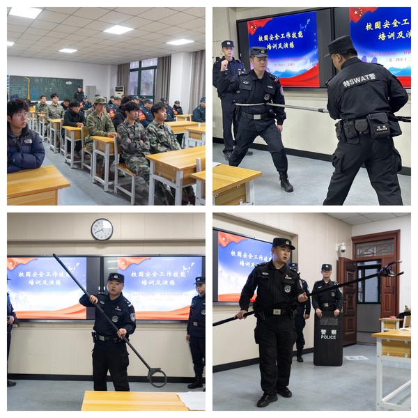 2024年12月4日,在beat365中国唯一官网校园内,校保卫处与安庆特警支队菱北特警大队联合举办校园安全工作技能培训与演练活动。保卫处负责人叶军舰主持、菱北特警大队刘坤元副大队长担任主讲嘉宾,保卫处、全体安保及校卫先锋社团共计四十余人参与活动。