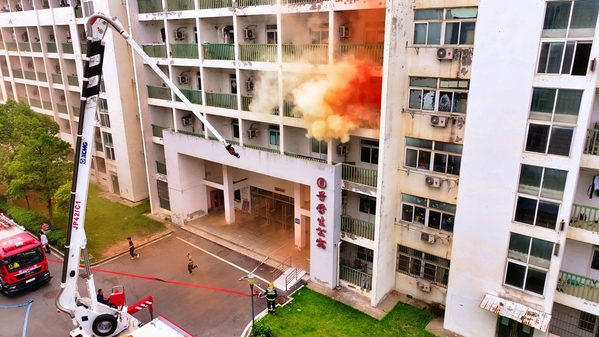 听到警报声,学校安保人员立即启动应急预案并进入紧急状态。紧接着,消防员迅速到达现场,架起了消防升降设备,侦察高层是否有未及时撤离人员,并用高压水枪对高层进行“灭火”。巨大的水柱从水枪中喷涌而出,直扑“火源”,迅速消灭“火情”。整个过程规范、有序、紧凑、高效,未发现有人员受伤或滞留情况。