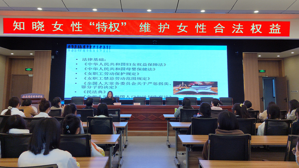为深入学习宣传贯彻党的二十大精神,依法保障女性师生的合法权益和特殊利益,3月29日下午,校妇联和校工会女工委联合开展妇女普法活动,特邀市司法局行政复议与应诉科科长张德梅举行题为“知晓女性“特权” 维护女性合法权益”专题讲座。校妇联部分执委、部分女教师代表及100多名女学生代表到场聆听了讲座。