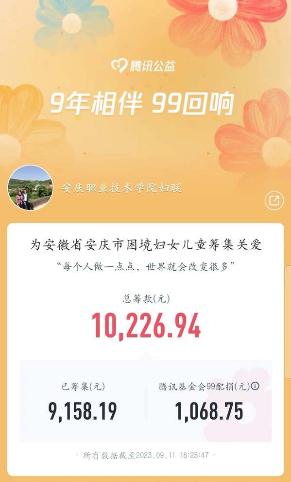 “99公益日”网络募捐活动是由腾讯公益慈善基金会联合国内数千家公益慈善组织发起的一项全民公益活动。此次活动自9月5日启动以来,得到校党委的高度重视,校妇联、校工会、校团委、校学生会联合发起“为爱‘益’起捐,汇聚小善大爱”的倡议,并在市妇联“加油徽姑娘”项目下组建战队;校领导班子全体成员带头响应,全程参与到这场“指尖公益”活动之中;各二级单位积极行动,引导师生正确认识公益,以活动培育师生公益精神,用行动传递或创造更多温暖价值。