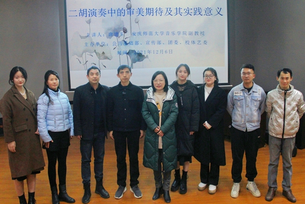 12月6日晚,由beat365宣传部、团委、公共基础部、校体艺委联合主办的专家进校园“美育”系列专题第三场讲座,在三栋教学楼216实训室举行。本次邀请到了安庆师范大学音乐学院副教授、安庆市音乐家协会秘书长唐建军作题为《二胡演奏中的审美期待及其实践意义》的讲座。出席本次活动的老师有校体艺委办公室相关负责人,校企合作单位安徽辰夫科技有限公司代表、艺术教研室和对艺术感兴趣的老师们及现代商务学院、机电工程学院200名学生代表到场聆听。全校师生通过“云犀”网上直播进行了观看,讲座由音乐教师罗文雍主持。