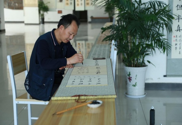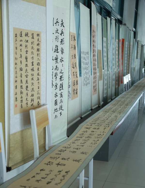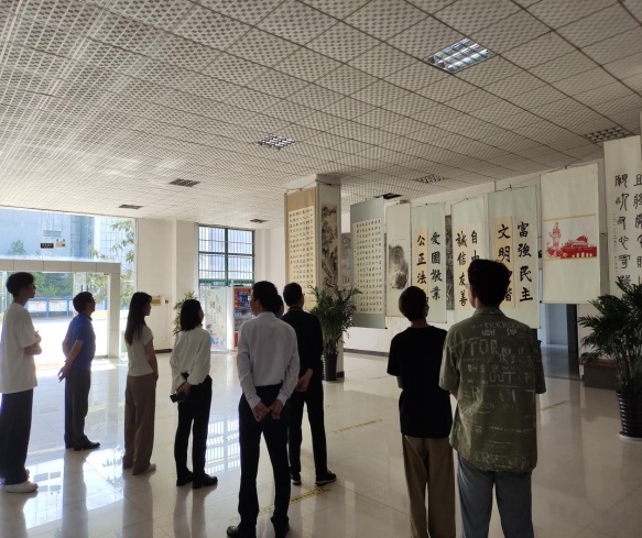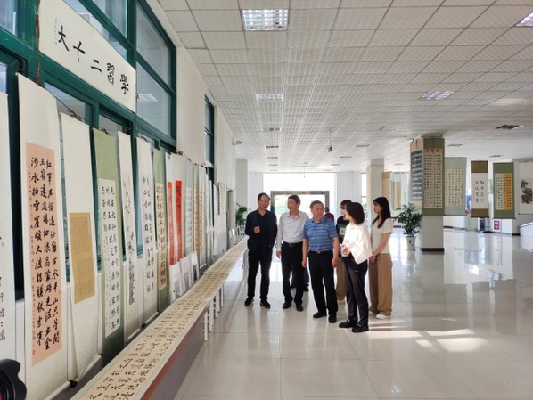 布展期间,公共基础部张林、王柏翠老师,语委办张铮老师,校工会彭金德、章杰义老师等莅临指导,并鼓励社团“不忘初心,砥砺前行”,潜心钻研书画技艺,进一步扩大逸风书法社影响力。