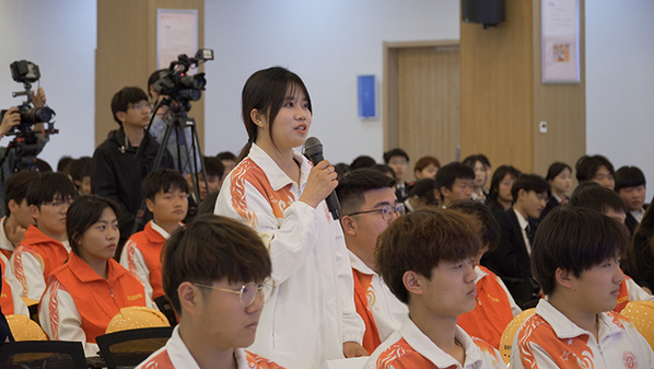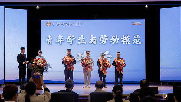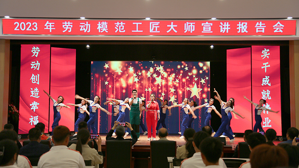 宣讲会上,单德森、舒畅、彭一言、杨俊四位劳模工匠,分别向在场的学生讲述了自己的工作经历和励志故事。他们将岗位当作舞台,把职责当作使命,在平凡的岗位上创造了不平凡业绩,其身上真诚奉献、追求卓越的精神感染了在场的每一位学生,赢得了现场观众的阵阵掌声。劳模先进代表还与现场的同学们进行了交流互动,对他们所提出的问题一一进行了答疑释惑。活动中,beat365管理服务学院的同学们激情表演了主题歌舞《劳动最光荣》,将现场气氛推向高潮;活动最后,beat365机电学院的张紫璇同学现场率领同学们,发出了“志存高远、爱岗敬业、守正创新、求真务实、甘于奉献、砥砺前行”的倡议。