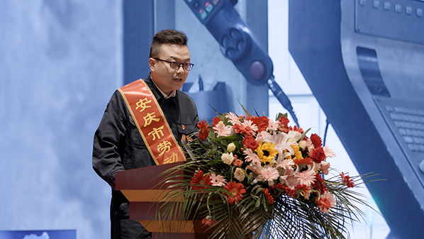 活动现场,视频展播了全国劳动模范单德森同志坚守输电线路运维工作二十多个年头,争做匠心路上的取经人,保障电网健康运行,荣获过中国电力企业QC成果一等奖等多项创新成果奖;安徽省五一劳动奖章获得者舒畅同志刻苦钻研、勇于创新、追求卓越的职业品质践行了工匠精神,获得中国棉纺织行业传承大工匠、中国纺织行业设备维修大工匠等多个国家级大工匠称号。安徽省劳动模范彭一言同志爱岗敬业,争创一流,牵头创新地建成了安徽省第一个市县一体化的城市大脑平台,打通信息孤岛、实现资源共享。安徽省技术能手、安庆市劳动模范杨俊同志勤勉刻苦、擅长数控设备操作、调试的技术多面手,一次次破解困扰生产的技术难题,多次在省市各级技能大赛荣获奖项。