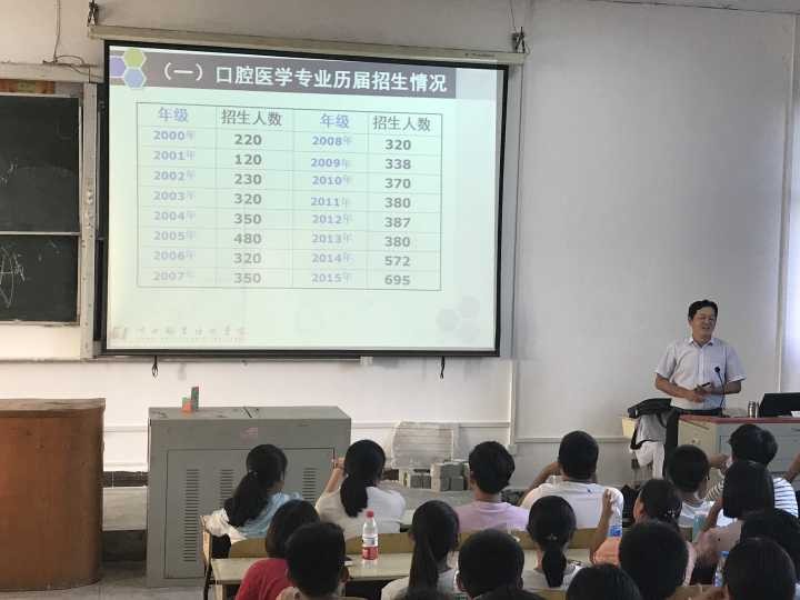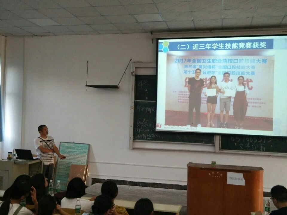 为了让口腔医学专业大一新生了解自己所学专业,尽早适应大学生活,澳门网投唯一官网于2017年9月12日及13日,分别在4-102、4-201、4-202、阶梯教室举办了以专业介绍为主题的报告会。2017级口腔医学专业全体学生参加了本次报告会。