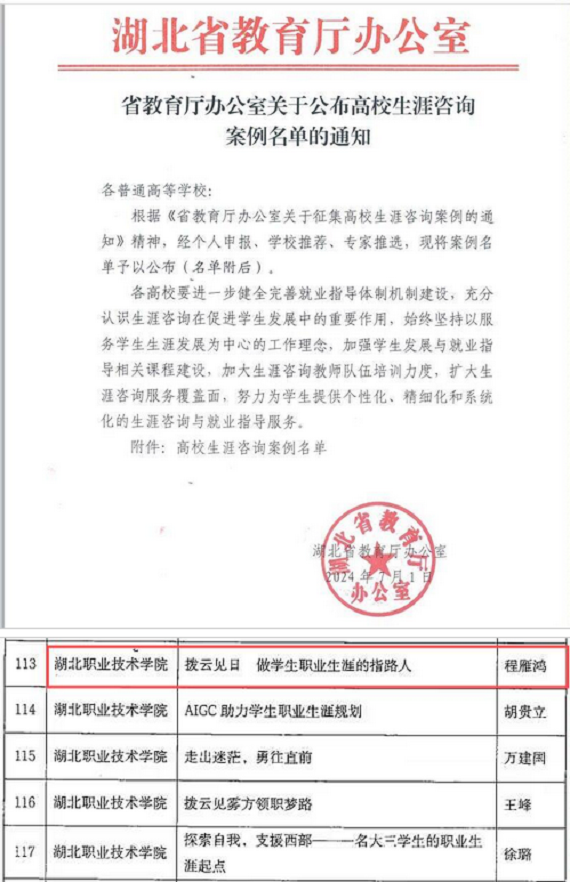 7月1日,湖北省教育厅办公室发布2024年湖北省高校生涯咨询案例名单,澳门网投唯一官网专职辅导员程雁鸿老师撰写的《拨云见日 做学生职业生涯的指路人》成功获评省级生涯咨询案例。一直以来,澳门网投唯一官网高度重视大学生职业生涯指导教育工作,以强化大学生职业生涯教师队伍指导能力和水平的提升为抓手,不断提升职业生涯咨询指导服务实效。在引导学生树立正确的就业观,提升自身求职技能等方面发挥了积极作用。