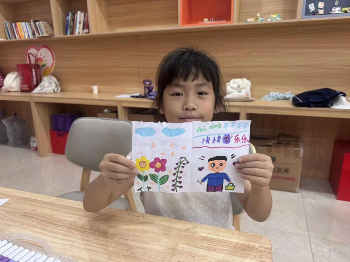 最后的“感恩时刻·爱意传递”,志愿者们化身为“爱的信使”。他们将精美的信纸与信封递到孩子们手中,轻声鼓励大家勇敢写下内心的话语。待信件完成,又小心翼翼地收集整理,庄重地送到父亲们手中。在“爱的拥抱”仪式环节,志愿者用镜头记录下一个个感人瞬间,为每个家庭留存这份珍贵的回忆。活动结束时,志愿者们还将定制的纪念相框送到大家手中,并送上真挚的祝福。