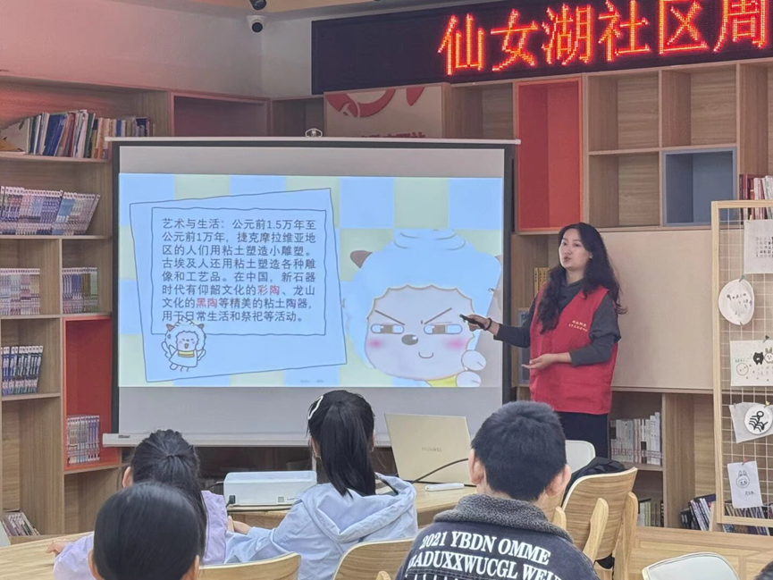 清晨8时,志愿者们准时集合,统一前往社区。抵达后,大家迅速整理场地、检查教具与书籍,确保各环节准备就绪。上午9时活动正式开始,志愿者首先引导孩子们归还此前借阅的书籍与学习用品。随后进入PPT讲解环节,主讲人以生动有趣的方式介绍黏土制作步骤,并不时提问互动,激发孩子们的参与热情。其余志愿者则分工协作,维持课堂秩序、记录活动瞬间。