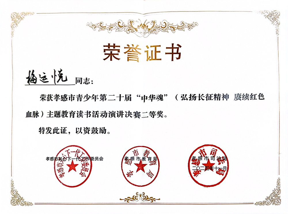 随后,在11月26日举行的孝感市青少年第二十届“中华魂”主题教育读书活动演讲决赛暨第十二届“孝行月”实践教育活动总结大会上,梅运悦老师代表学校参赛,与来自全市的27名选手同台竞技。她以铿锵有力的话语诠释红色信仰,以饱满的热情展现我校师生积极向上的精神风貌,经过激烈角逐,荣获二等奖。
