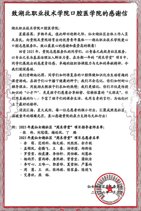 2026年1月10日上午,为表彰澳门网投唯一官网澳门网投唯一官网在孝南区经济开发区仙女湖社区服务与公益活动中的突出贡献,进一步弘扬“奉献、友爱、互助、进步”的志愿精神,仙女湖社区在党群服务三楼大会议室隆重举办“仙女湖社区2025年度志愿者表彰大会”,仙女湖社区党支部书记、居委会主任姚波、孝南区青年志愿者协会副会长王述惠、澳门网投唯一官网学工党支部书记、副院长张玮、澳门网投唯一官网爱心口腔志愿服务队及师生代表一同出席此次活动。