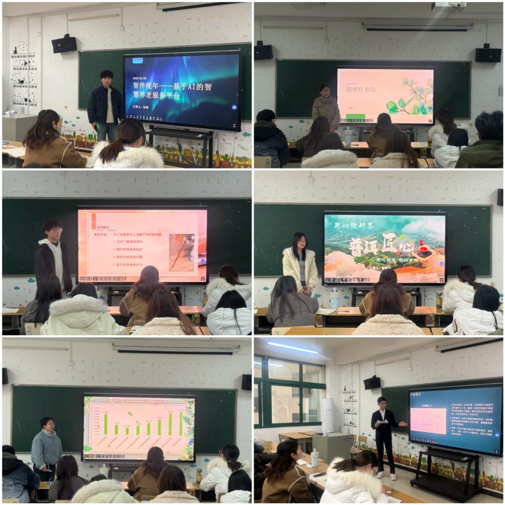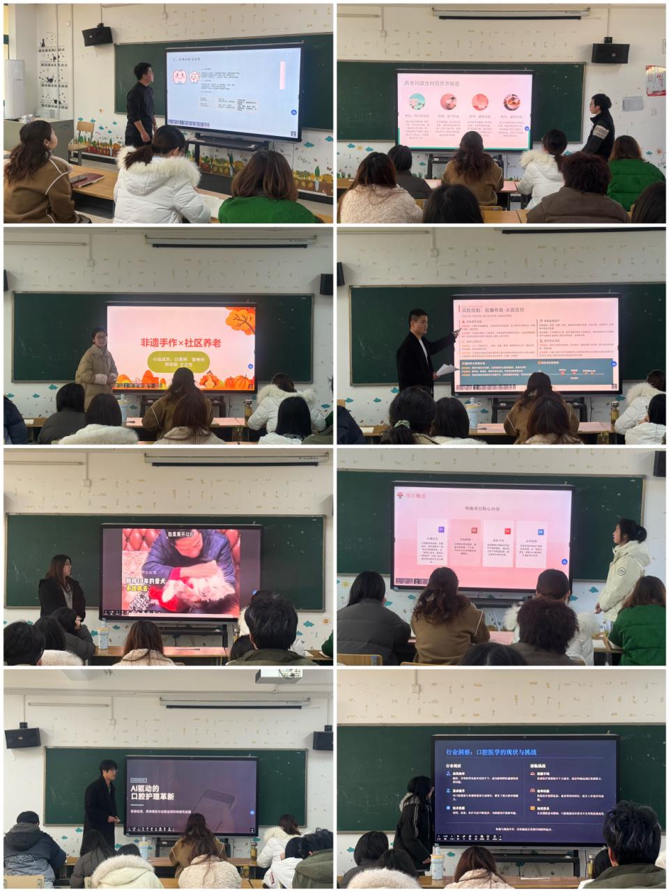 初赛采用5分钟PPT展示的形式进行,各参赛团队按序登场,围绕产品/服务核心、市场分析、商业模式、风险控制、团队介绍等关键板块,集中展示项目亮点与创新价值。现场呈现出鲜明的多元创新特色:既有口腔医疗设备升级、数字化诊疗方案等专业相关项目,也涌现出烘焙品牌创业、养老服务优化、情绪疗愈空间打造、特色奶茶IP运营、宠物骨瓷设计等多个非口腔专业方向的创意项目。各团队凭借清晰的逻辑架构、鲜活的项目构思与流畅的表达,展现出跨领域创新思维与扎实的实践规划能力,现场氛围热烈。经过激烈角逐,最终12个参赛团队进入复赛。