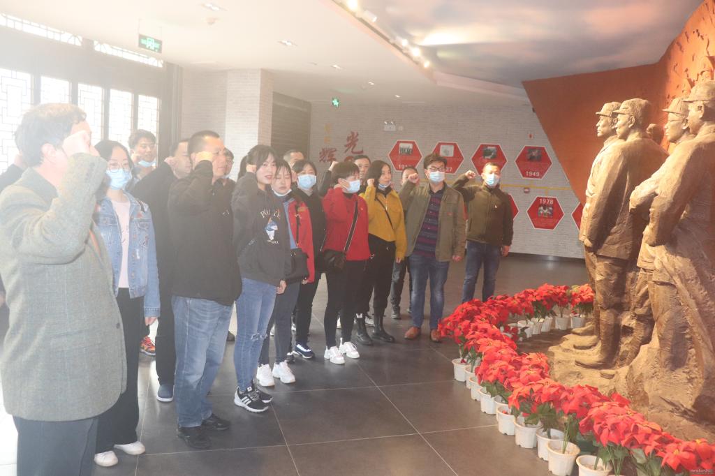 一行人首先来到位于武汉市黄陂区姚家山新四军第五师陈列馆,全体党员重温了入党誓词后,在纪念馆讲解员的带领下认真观看陈列馆六个部分的主题展,即“木兰烽火”、“怒潮喷涌”、“挺进鄂豫”、“中原抗战”、“战略包围”和“辉煌胜利”,同志们在大量历史图片和珍贵文物前驻足,仔细聆听每—个感人悲壮的战斗故事,通过展室里的文字、图片、实物样品等真实了解了新四军第五师在抗战时期那段百折不挠、骁勇善战的光辉历史。