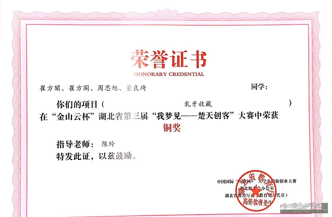 在本次大赛中,我校3支参赛队伍获得“金山云杯”湖北省第三届“我梦见-楚天创客”大赛铜奖,分别是财经学院的《疫情背景下渠道下沉式农民工招聘与派遣》、信息学院的《童智未来》、澳门网投唯一官网的《乳牙收藏》。创造了我校在该赛事中的新纪录。
