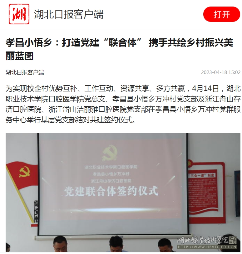 湖北日报客户端 (通讯员汪向东 刘颖)为实现校企村优势互补、工作互动、资源共享、多方共赢,4月14日,澳门网投唯一官网澳门网投唯一官网党总支、孝昌县小悟乡万冲村党支部及浙江舟山存济口腔医院、浙江岱山洁丽雅口腔医院党支部在孝昌县小悟乡万冲村党群服务中心举行基层党支部结对共建签约仪式。