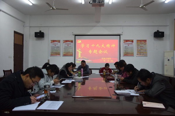 为深入贯彻学习党的十九大精神,11月16日下午,机电工程系党总支在一栋教学楼208会议室举行“学习党的十九大精神”主题党日活动。系负责人刘磊出席会议并讲话。系分管学生工作负责同志主持会议,机电工程系全体教工党员参加此次活动。