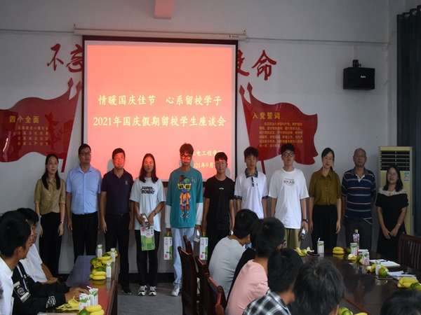 9月30日下午,机电工程学院在1号教学楼208会议室举行了“情暖国庆佳节  心系留校学子”国庆假期留校学生座谈暨慰问活动。学院党总支书记、院长刘磊携党政班子成员及辅导员老师代表出席,21级新生代表共计20余人参加座谈会。