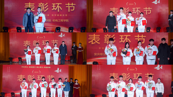 本次晚会还设置了表彰环节,学院对2022-2023学年获得国家奖学金获得者,“互联网+”大赛、创新创业大赛、职业技能大赛等获奖同学,国家励志奖学金获得者、英语四级通过者、三好学生、优秀学生干部、先进班集体等代表进行了表彰。一份耕耘一份收获,通过表彰先进,树立典型,进一步激发和调动了机电学子学习的上进心与积极性。