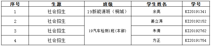 机电工程学院2019级新能源班(扩招桐城)学生余亮,2019级汽车检测与维修1班(扩招本部)姜立涛、朱清,方正一直未参与规定的教学活动,辅导员多次联系学生及其家人,未果。现根据《beat365中国唯一官网社会扩招学生学籍管理实施办法(试行)》的相关规定,要求以上4位同学于2024年4月23日前务必联系辅导员参加规定教学活动,否则将依据《beat365中国唯一官网社会扩招学生学籍管理实施办法(试行)》第二十六条规定,视为自动放弃学籍,按自动退学处理。