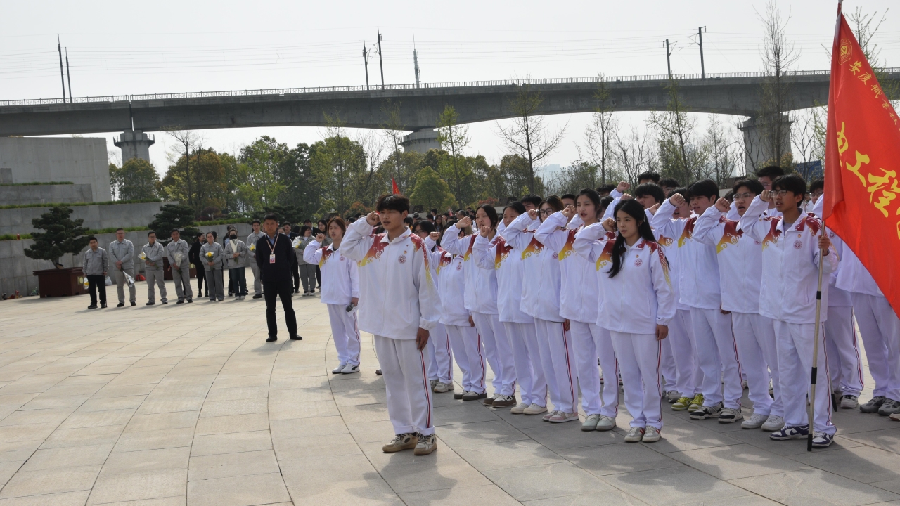 “我志愿加入中国共产主义青年团……”在团员代表刘子君的领誓下,全体共青团员面向团旗,高举右拳,重温入团誓词。铿锵有力的誓言在陵园上空回荡,展现了新时代青年不忘初心、牢记使命的坚定信念。