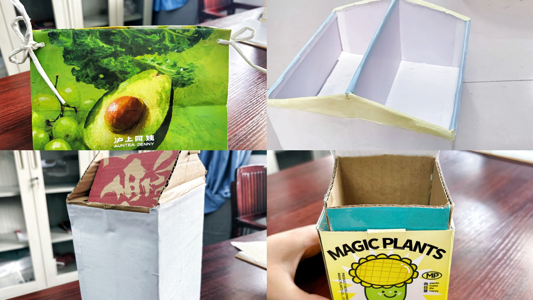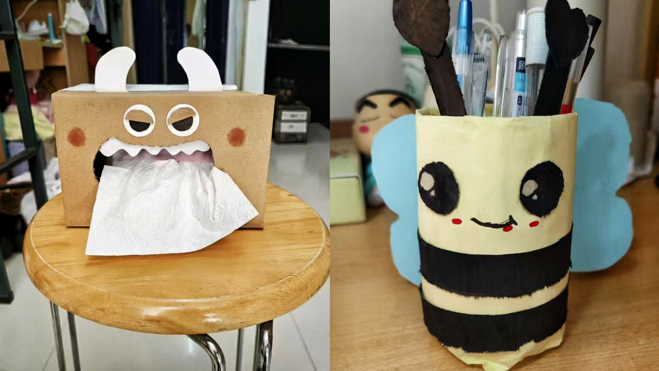 一部分同学利用废旧纸箱或者包装袋制作出实用的收纳盒,不仅解决了收纳难题,还为宿舍环境增添了一份质朴的美感。例如,有的同学将平时的奶茶包装袋制作成餐巾纸盒,既美观又实用;有的同学将快递盒改造为物件收纳盒或者笔筒,做到了废品的有效利用;还有的同学利用快递盒制作手动开关垃圾桶,让日常生活中的垃圾有处可去。