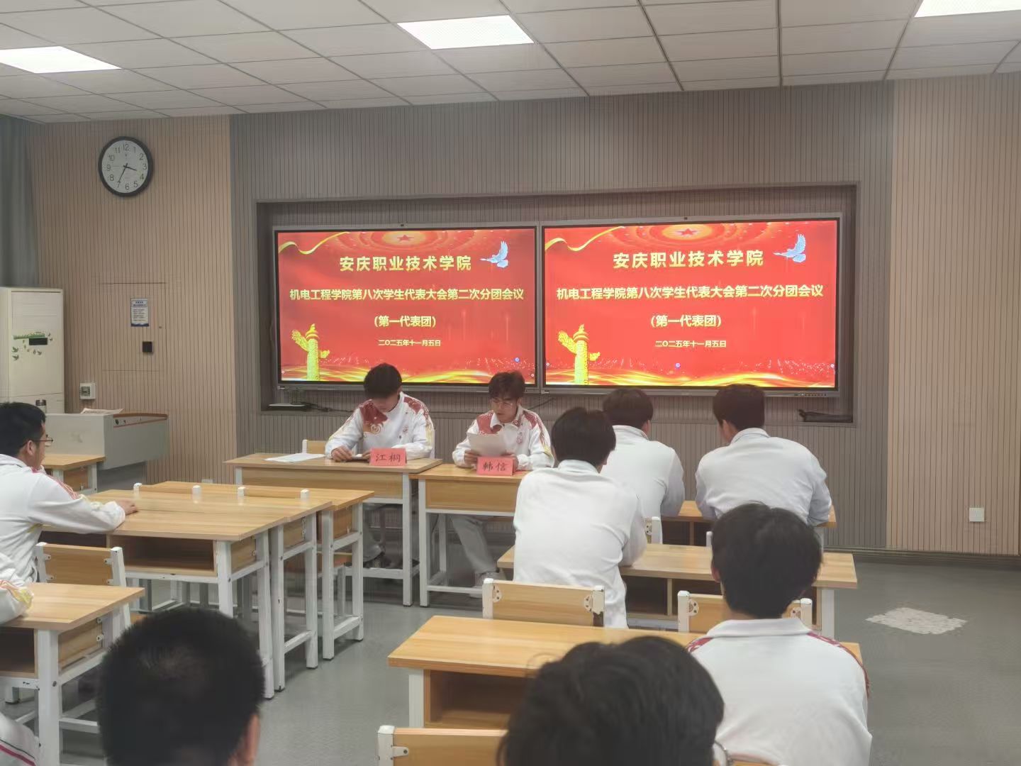 在第一次全体会议上,全体代表听取并审议通过了第七届学生委员代表杨子强同学所作的工作报告,表决通过了总监票人、监票人、总计票人、计票人名单(草案)。在第二次全体会议上,代表们表决通过了学生委员候选人预备人选建议名单(草案)、学生会主席团候选人预备人选建议名单(草案)以及机电工程学院第八次学生委员会委员选举办法(草案)。