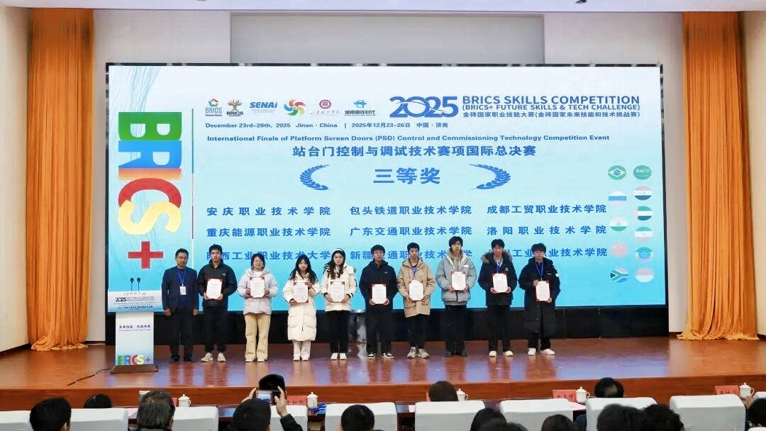 12月22日至26日,2025金砖国家职业技能大赛站台门控制与调试技术赛项国际总决赛在山东职业学院举行。来自全国31所院校的选手同台竞技,李陶胜、王淑芳两位老师指导的轨道交通运营管理专业学生冯术鹏、张宇航,荣获大赛“三等奖”。
