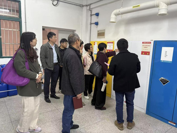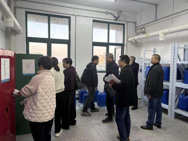 专家组在听取安全管理工作汇报后,认真查阅了学校实验室安全管理制度、隐患台账、日常安全检查记录、应急预案等资料,并深入农林与服装学院危化品储藏室、危废中转站、化学实验室及博士科研工作站等实验室实地查看。