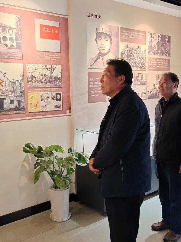 大家依次参观了黄镇生平事迹陈列馆中将军之旅、外交之途、艺术之路等展厅。在一幅幅图片、一件件实物前,大家纷纷驻足凝视,通过丰富翔实的珍贵图片、实物及文献史料,系统了解了黄镇作为将军、外交家、艺术家革命的一生、战斗的一生和无私奉献的一生。全体人员向黄镇同志的塑像三鞠躬,深切缅怀他对中国革命、建设、外交和文化事业做出丰功伟绩。