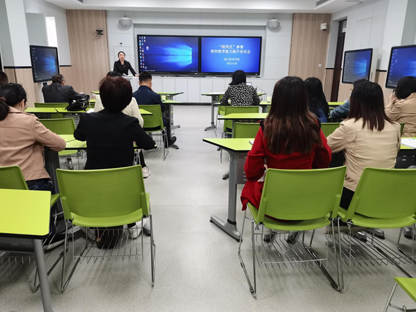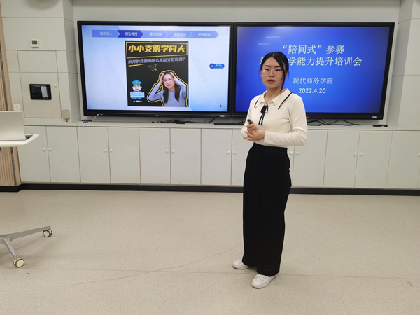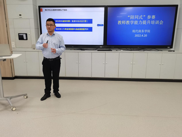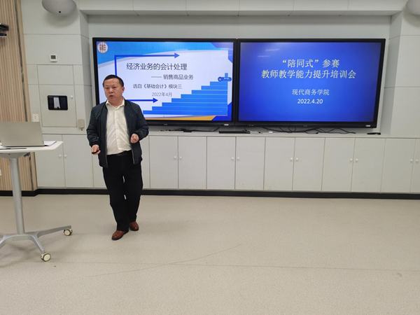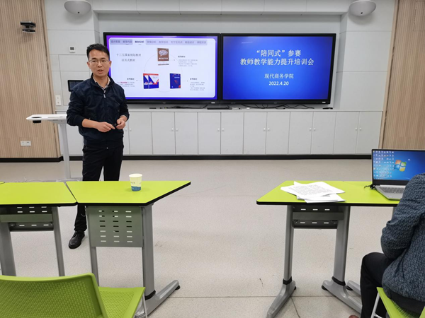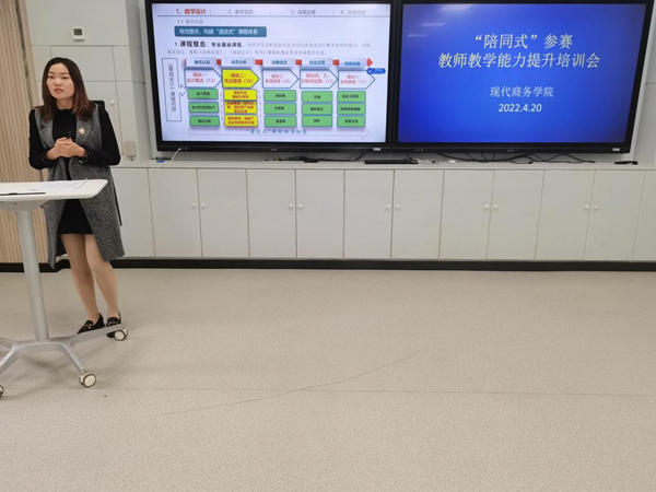 4月20日下午,现代商务学院在校2-102智慧教室举办教师教学能力提升展示交流活动,就“陪同式”备赛模式开展实践交流,全体教师参加此次活动。