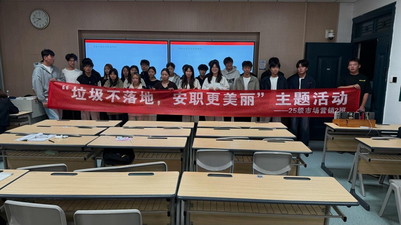 活动尾声,同学们返回班级参与横幅签名环节。25级市场营销二班班长刘宇杰发出倡议:“美好的环境不是天生的,需要每个人的文明行为来维护。”同学们纷纷在“垃圾不落地,安职更美丽”的横幅上签下自己的名字,这是对守护校园环境的郑重承诺。