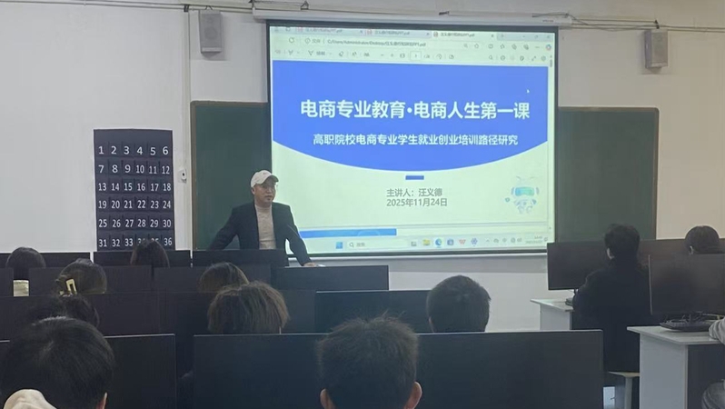 2025年11月26日下午,现代商务学院在2号实训楼506教室成功举办了一场以《乡村振兴视域下高职院校电商专业学生就业创业培训路径研究》为主题的专题报告会。此次报告会邀请安徽省产业教授、安徽云霁电子商务有限公司总经理汪义德主讲,现代商务学院电商专业教师及辅导员代表、24级云霁电商1班全体学生参加学习交流。
