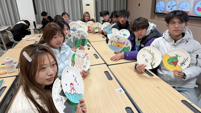 活动中,班级团支书讲解中国传统二十四节气的历史渊源与习俗故事,并普及盘画构图技巧与色彩搭配知识。创作环节,大家以纸盘为画布、水彩为笔,将节气元素与创意巧思相融:嫩绿柳枝配飞燕勾勒春分生机;金黄稻穗映圆月尽显秋分丰饶;傲雪寒梅伴落雪诠释冬至静谧……部分作品点缀节气诗词,兼具美感与文化底蕴。两小时后数十幅精巧作品完成,同学们相互交流构思,分享创作灵感与节气寓意。