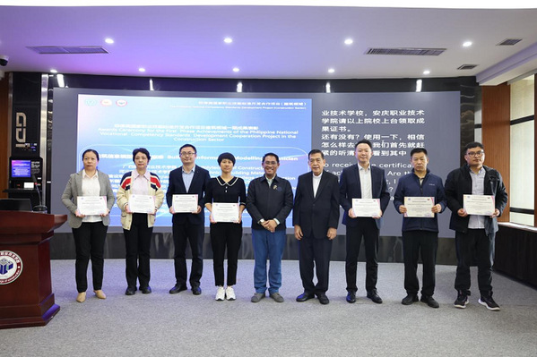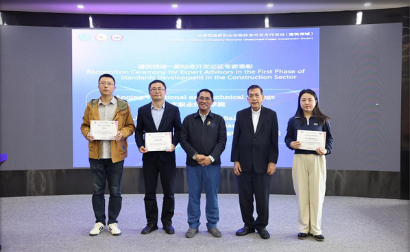 浙江建院副校长徐哲民、菲律宾职业技术教育与技能发展署资格与标准办公室执行署长埃尔・西德・卡斯蒂略、中菲丝路学院基金会主席张红阳在会上先后致辞。菲方代表充分肯定了beat365建工团队参与编制的《智能楼宇管理员标准》《防水工标准》《建筑信息模型技术员标准》等三项技能标准,并向教师代表颁发了成果证书。