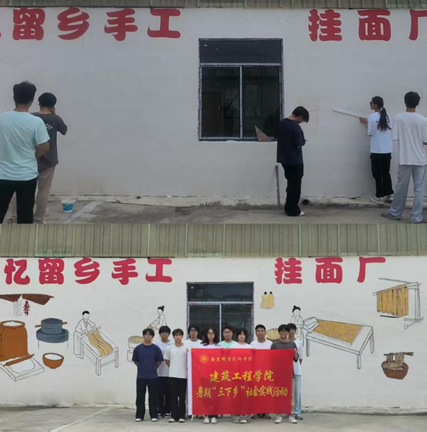 8月28日-30日,在平岭村忆留乡手工挂面加工厂内,一幅32平方米的彩色墙绘正悄然成型。建筑工程学院“青春画笔,点亮乡途”实践团的青年学子们,以汗水为墨、专业为笔,将传统手工挂面的制作流程描绘下来,用艺术实践书写乡村振兴的青春答卷。
