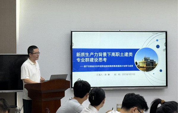 为进一步聚焦省双高专业群建设任务,探索新质生产力背景下高职土建类专业群建设路径,提升教师专业素养与教学改革能力,9月17日下午,建筑工程学院开展专业群建设讲座,该院教学副院长张赛立足安徽省2025年度职业院校教师素质提高计划培训学习成果与思考,向全院教师作了题为《新质生产力背景下高职土建类专业群建设思考——基于安徽省2025年度职业院校教师素质提高计划学习成果》专题讲座,建筑工程学院院长陈月萍教授、学院全体专业教师参加。