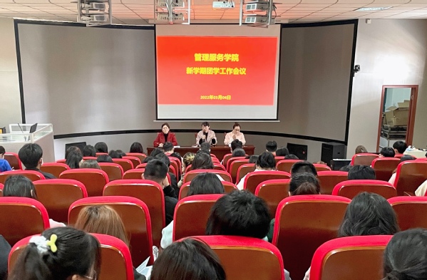 3月4日,管理服务学院团总支在三栋教学楼216教室召开新学期团学工作会议,学院党总支副书记丁凡、学生管理科科长汪婷、团总支书记梁妞及学生会成员参加了会议。