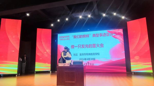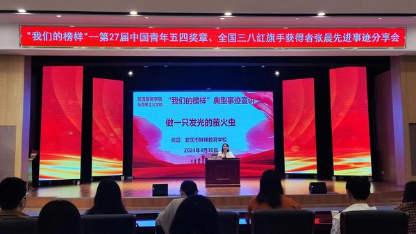 为了传承和弘扬五四精神,进一步强化先进典型示范引领作用,充分营造发现榜样、学习榜样、争做榜样的浓厚氛围,在“五一”国际劳动节和“五四”青年节前夕,4月30日,管理服务学院和马克思主义学院共同开展了“我们的榜样”典型事迹宣讲活动。活动邀请了第27届中国青年五四奖章获得者、全国三八红旗手--安庆市特殊教育学校教师张晨,管理服务学院党总支书记、院长陈颖携师生代表180余人参加宣讲会。