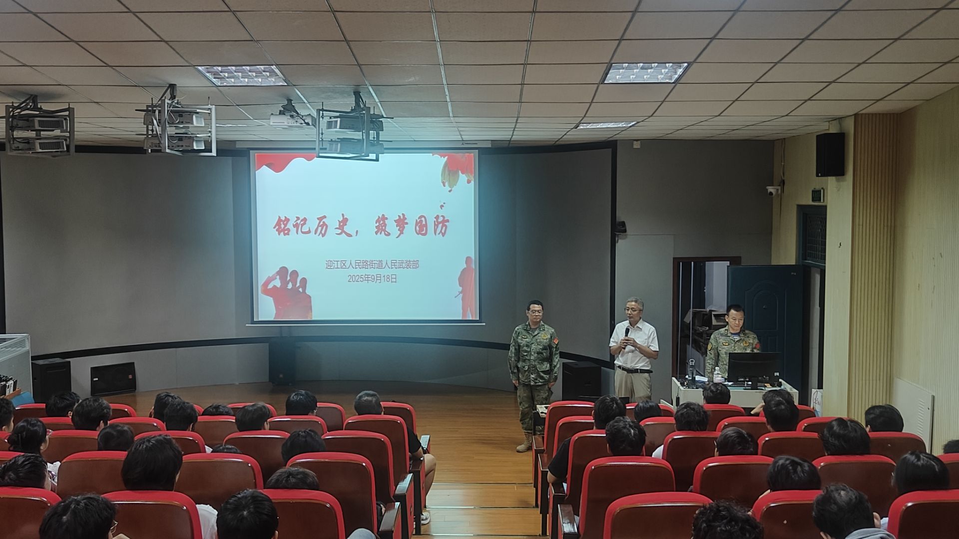 9月18日晚,学院联合武装部在图文报告厅开展征兵政策宣讲会暨爱国电影《八佰》展映活动,全体新生、学生管理负责人及辅导员参与。武装部从征兵条件、优待政策、职业发展等方面进行详细解读,结合真实案例鼓励适龄青年响应国家号召,以军旅生涯践行爱国誓言。宣讲会后,师生共同观看爱国电影《八佰》,影片中“四行仓库保卫战”的悲壮场景引发强烈共鸣。