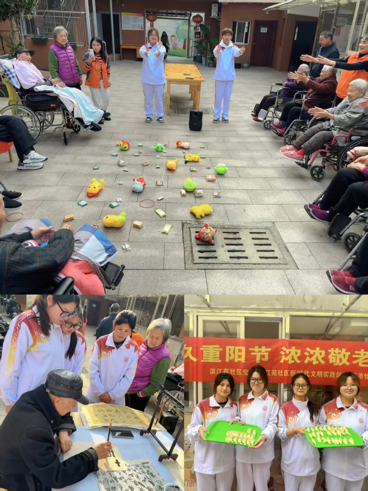 10月27日,志愿者们又奔赴大观区怡康滨江苑养老中心继续传递温暖。活动现场精心设置了书法创作区和饺子制作区。在墨香四溢的短桌前,老人们与学子共同执笔挥毫,在笔墨间感受传统文化魅力;一旁的长桌上,大家围坐包饺子,动作娴熟、笑语盈盈,温馨如家;套圈游戏区更是欢声不断,地上摆放的零食、布偶等奖品,为老人们带去了阵阵惊喜。青年志愿者们用专业服务传递温暖,以青春活力点亮银龄生活,在多姿多彩的活动中生动诠释了“老有所乐”的深刻内涵。