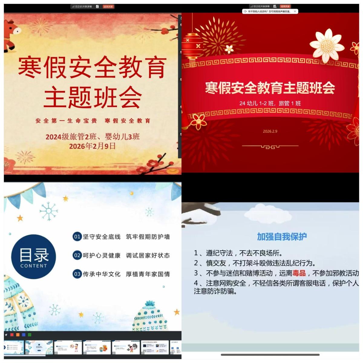 为加强寒假期间学生教育管理,落实“管理不断线、关怀常在线”的工作要求,2月7日至10日,管理服务学院组织各班级依托腾讯会议、钉钉、超星学习通等平台,集中开展了寒假线上主题班会活动。活动围绕安全教育、文化传承与心理健康三大主题,与学生及家长“云端”相聚,共同守护平安祥和的新春佳节。