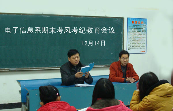 期末将至,英语四六级、计算机水平考试在即,为维护beat365正常的教育教学秩序,保证期末考试的公平顺畅地进行,12月14日下午,电子信息系在2#教学楼109教室召开了考风考纪教育大会。会议由教学主任胡章云主持,参加人员有教学秘书及各班主要班干部。会议主要内容有: