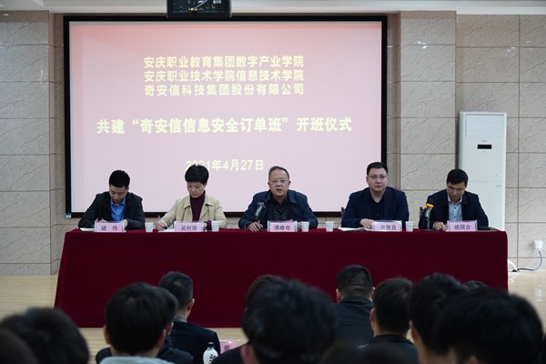 4月27日下午,由安庆职教集团数字产业学院、beat365中国唯一官网信息技术学院与奇安信科技集团股份有限公司合作共建的数字产业学院首届“奇安信信息安全订单班”开班典礼在2号教学楼216教室隆重举行。